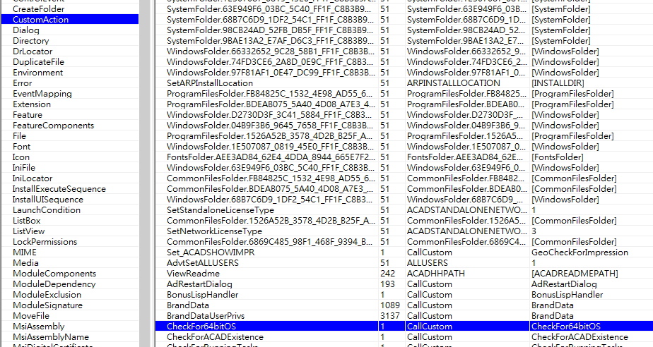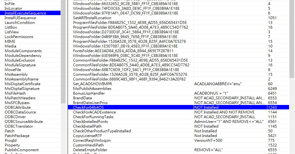 3.找到 InstallExecuteSequence -> CheckFor64bitOS 這行清掉 (按右鍵選擇 Cut Row)